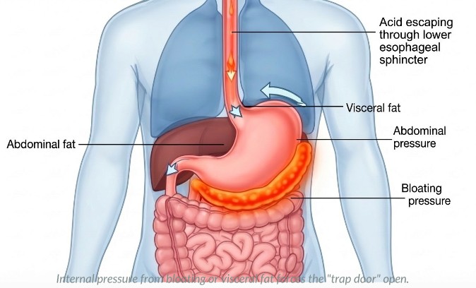 This upward pressure forces the “trap door”(the lower esophageal sphincter) to stay open,